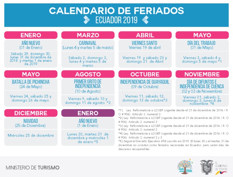 El primer será desde el viernes 1 de enero y une al sábado 2 y domingo 3. Así lo establece el calendario de feriados nacionales que fue difundido en el 2019 por el ministerio de turismo. Son cinco fechas de asueto que faltan para que se acabe el año y aquí te dejamos cuáles son y si son recuperables o no. En ecuador anualmente se cuenta con 11 días de descanso porque rige la ley de feriados desde el año 2016, la que determina los días de descanso obligatorio para todos los ecuatorianos. Calendario 2021 con los días festivos y fechas importantes de ecuador.